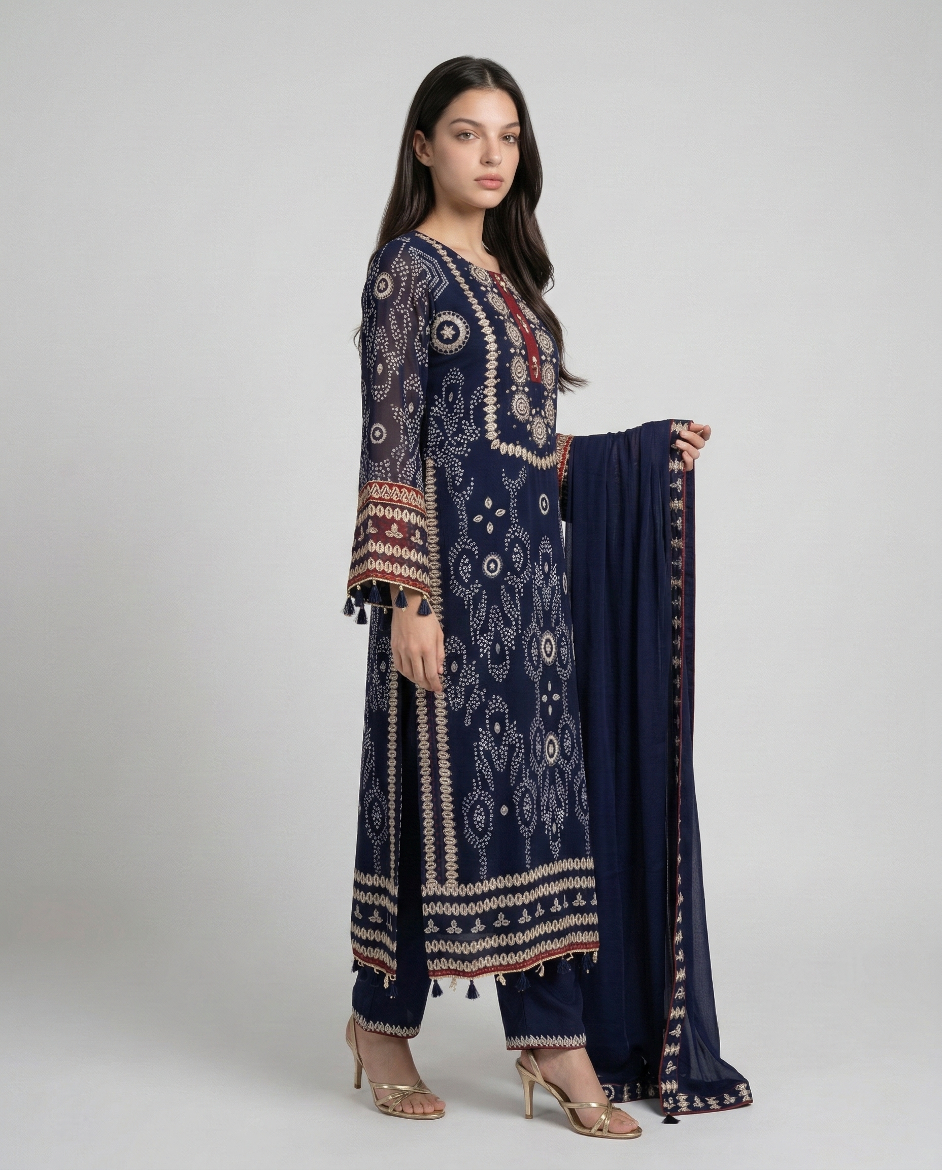 Elevate your festive wardrobe with this beautifully designed A-Line Kurta Pant and Dupatta Set in classic navy blue. Crafted from premium georgette fabric, the kurta features delicate embroidered detailing that adds sophistication and charm to the overall look.