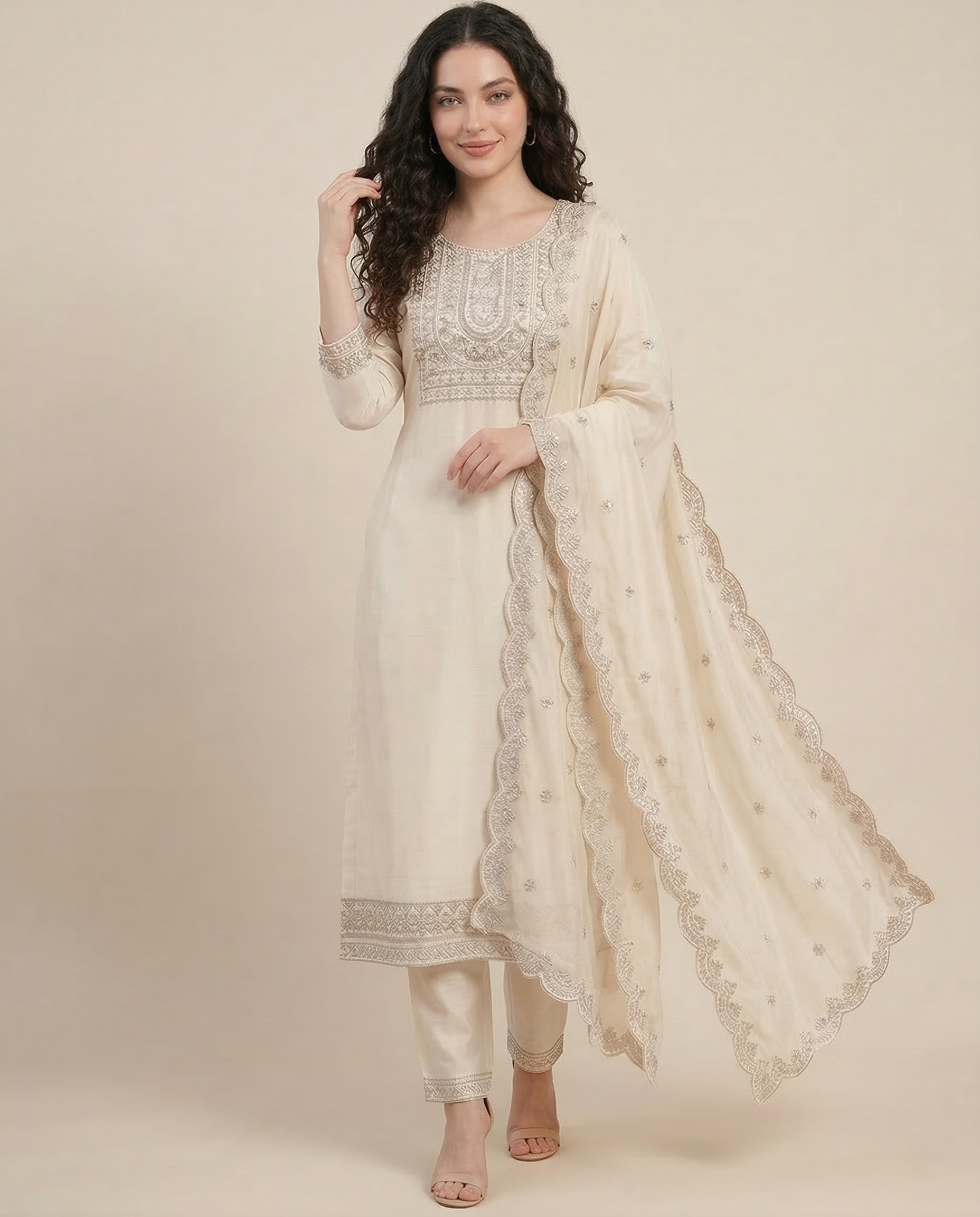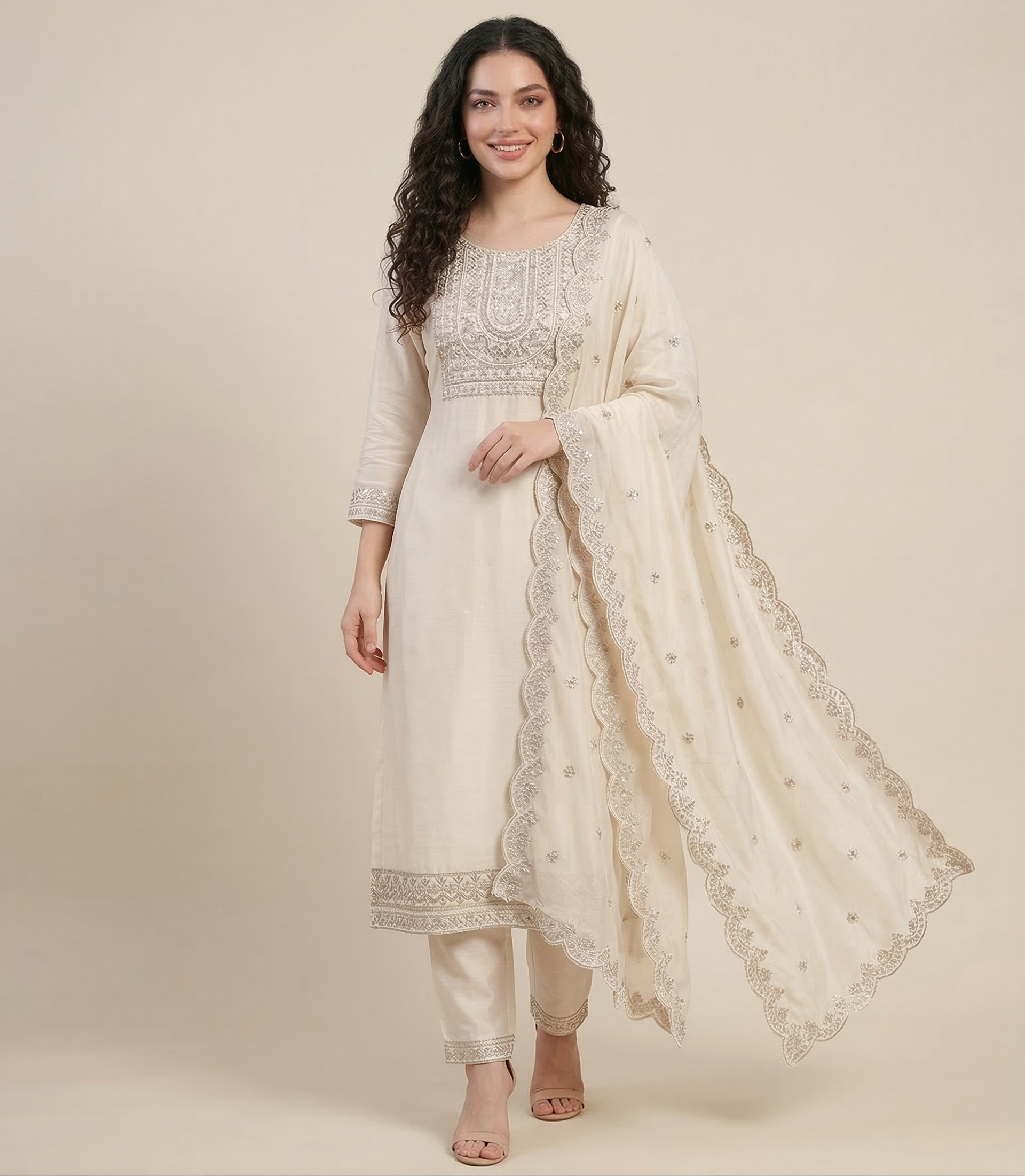 Add timeless elegance to your ethnic wardrobe with this beautiful Cream Embroidered Rayon Slub Kurta Set with Dupatta and Pants. Designed for modern women who appreciate traditional style, this outfit features a flattering A-line silhouette that enhances comfort and grace.