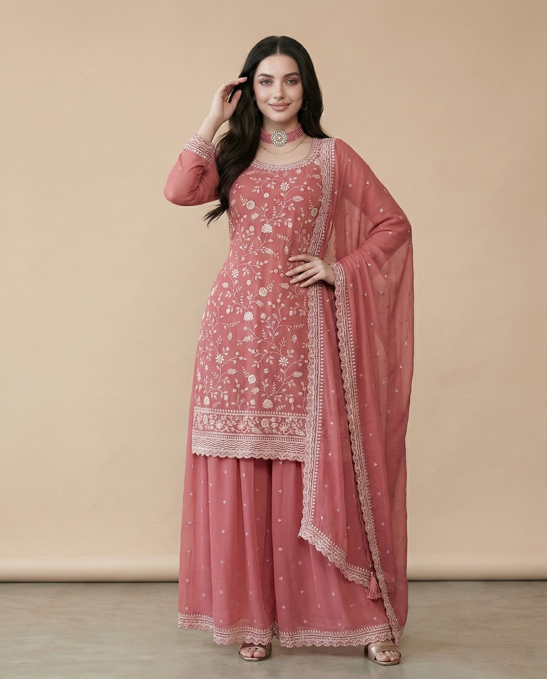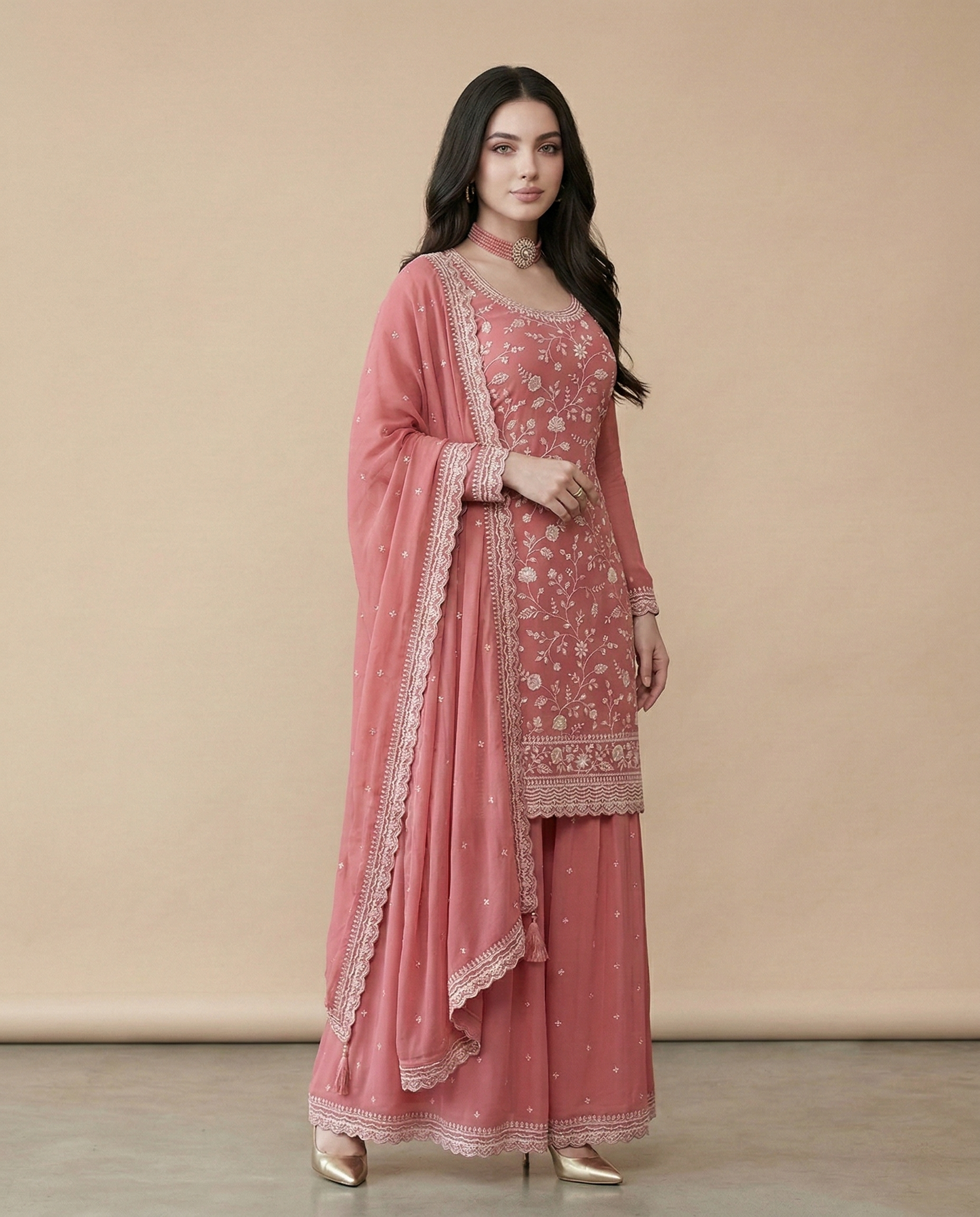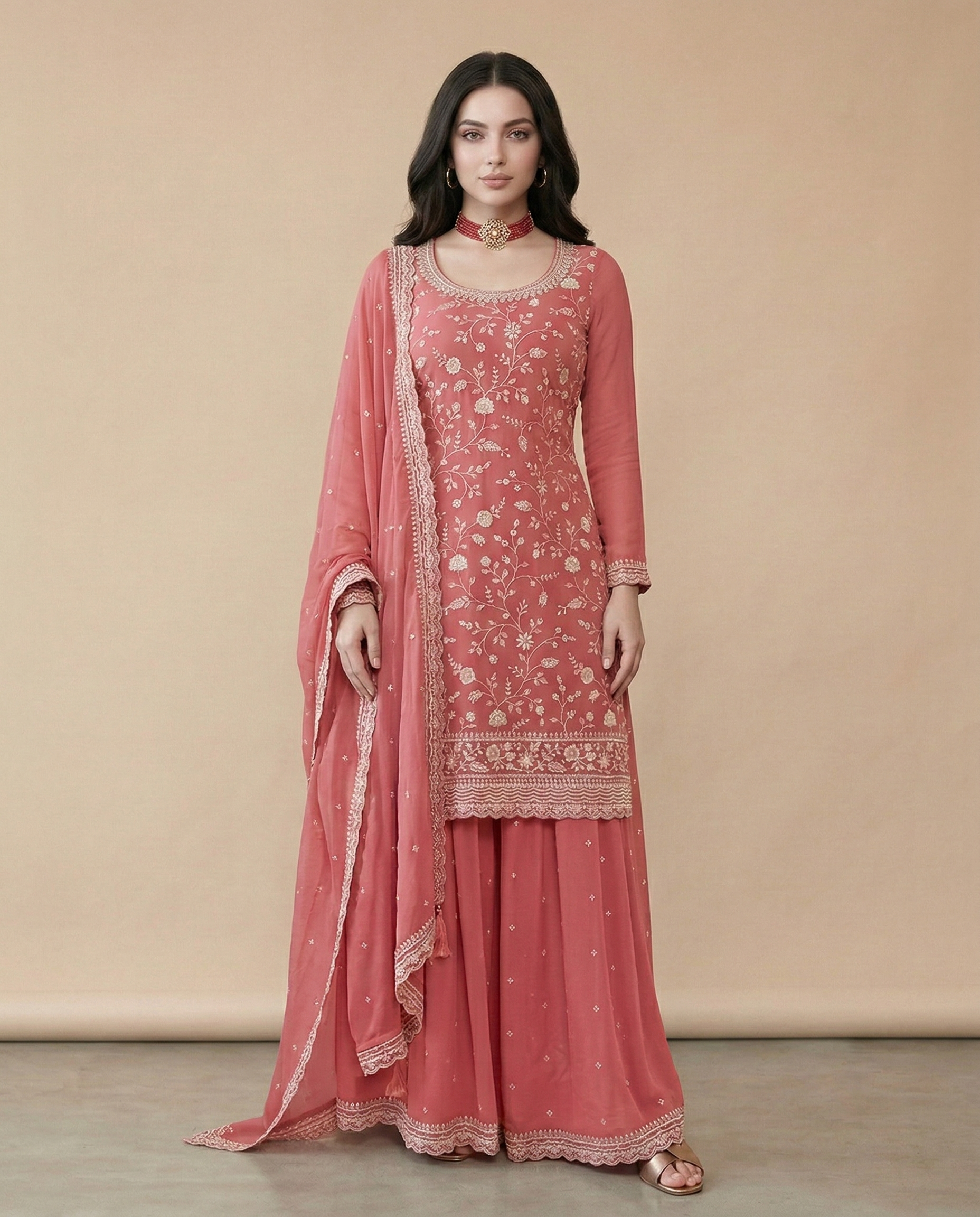 Elevate your festive wardrobe with this stunning peach embroidered sharara suit designed to blend elegance with traditional charm. Crafted from premium Vichitra silk, the outfit features intricate embroidery with delicate floral patterns that add sophistication and festive appeal.