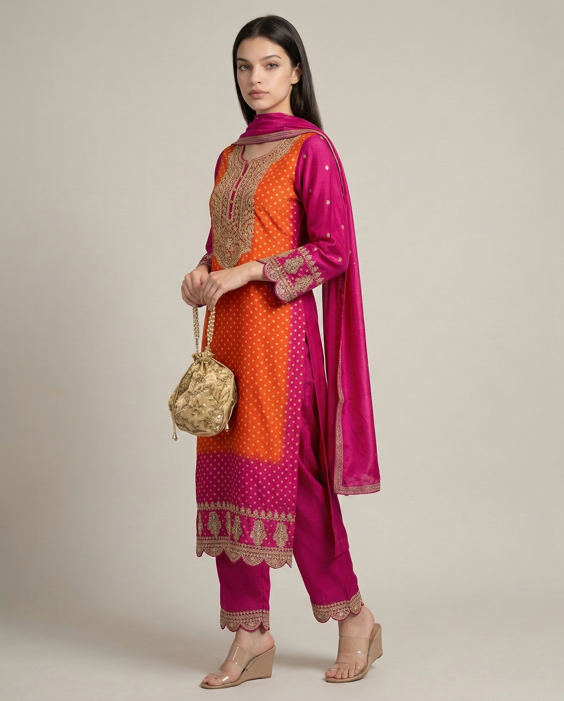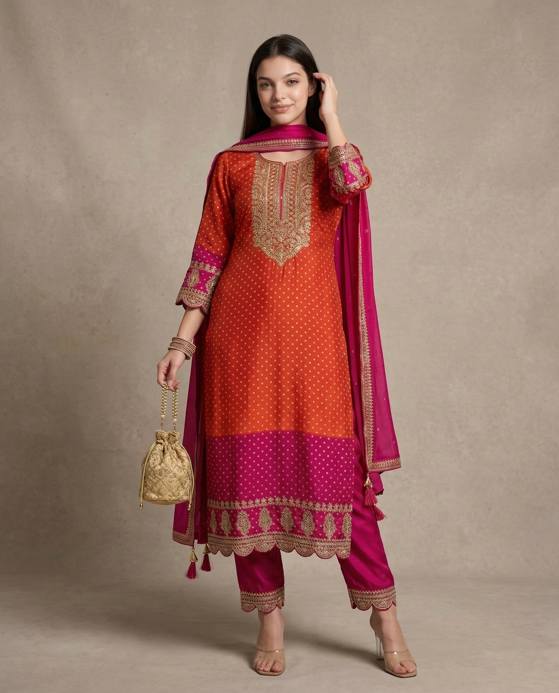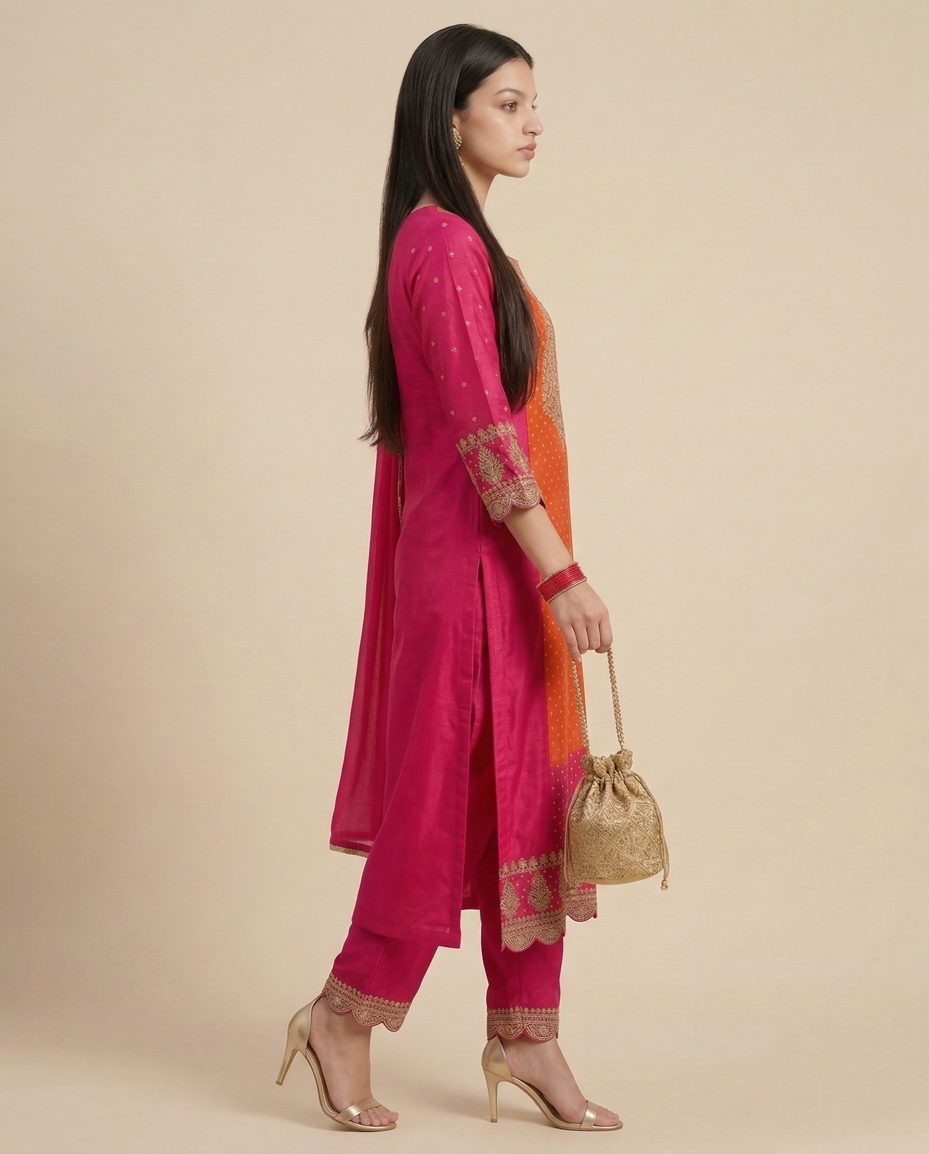 Step into timeless elegance with this beautiful pink embroidered kurta set . Crafted from premium silk fabric, the kurta showcases intricate embroidery and ethnic motif patterns that add a festive charm to the outfit.