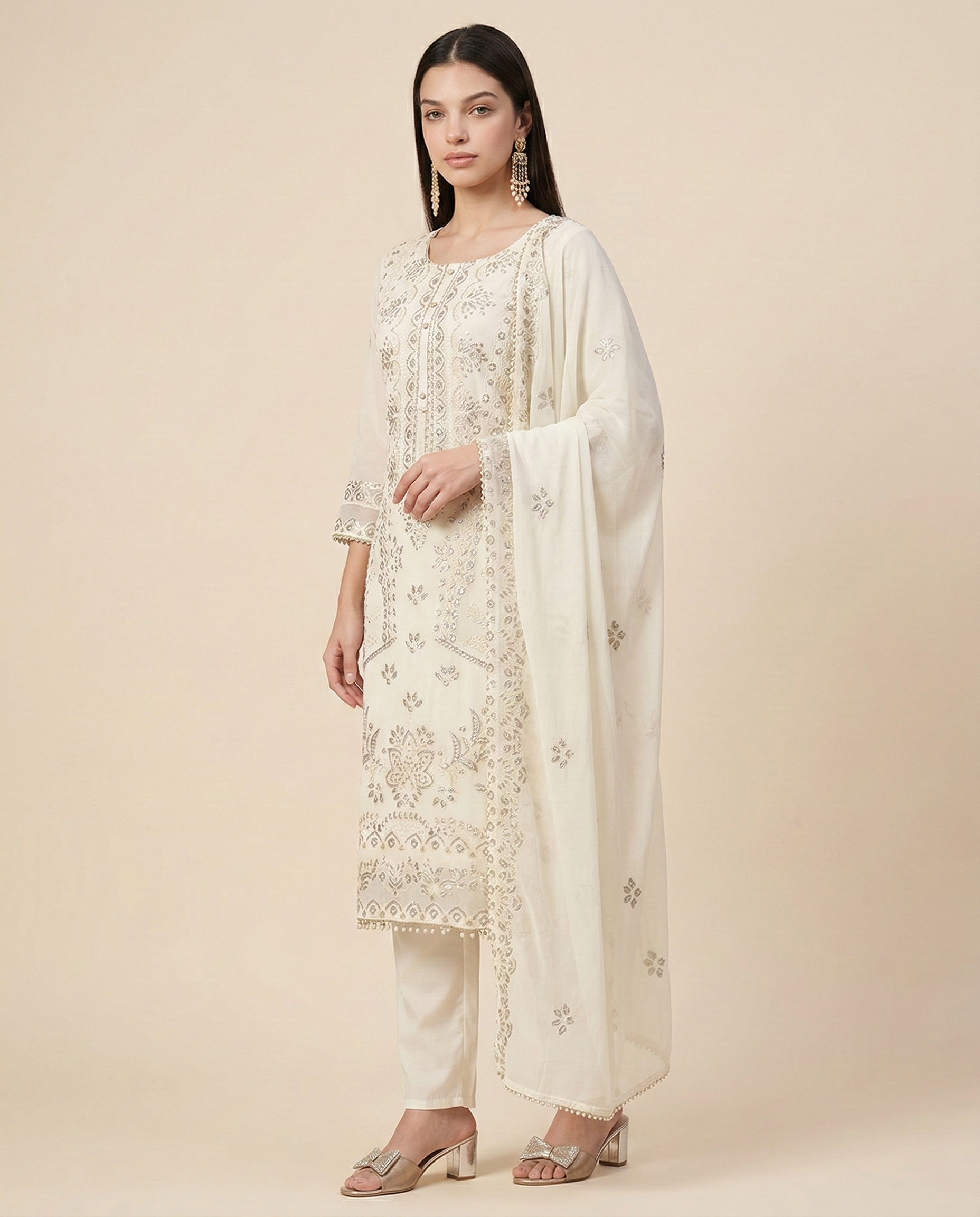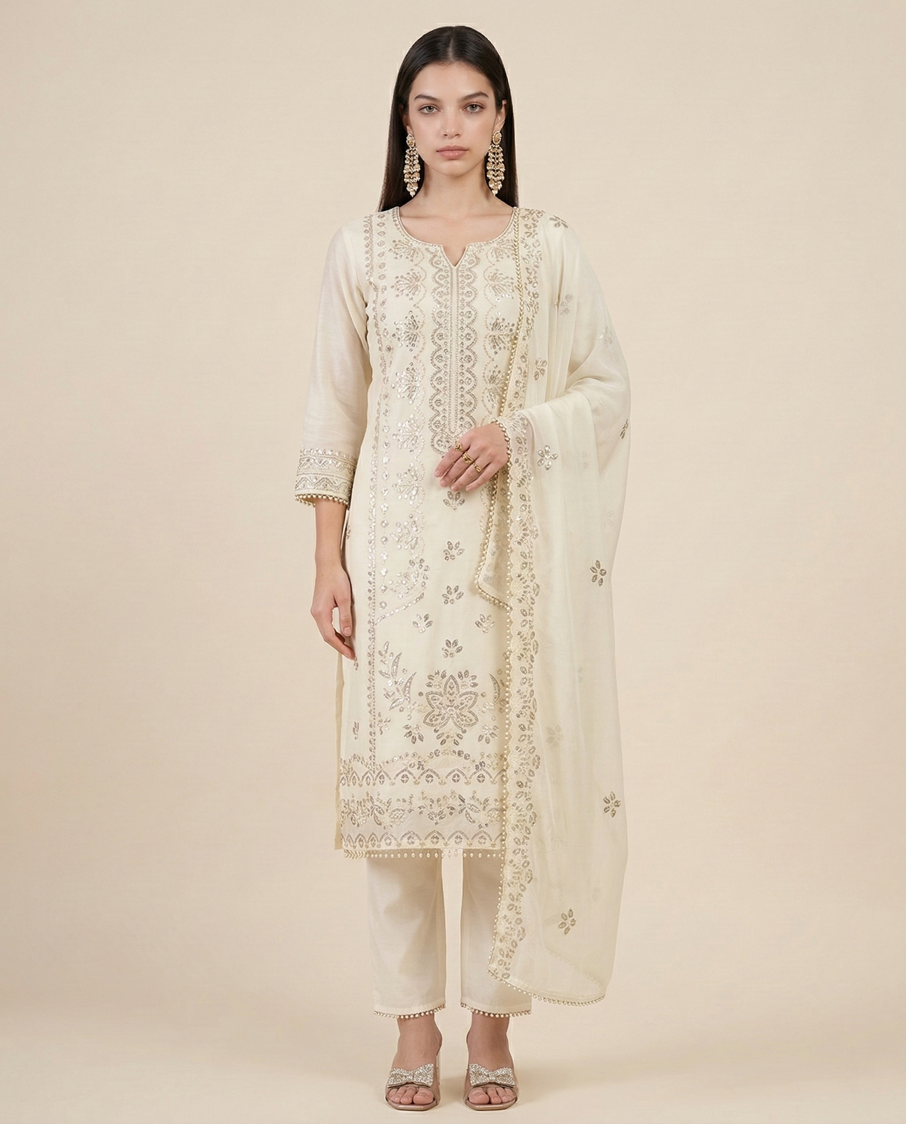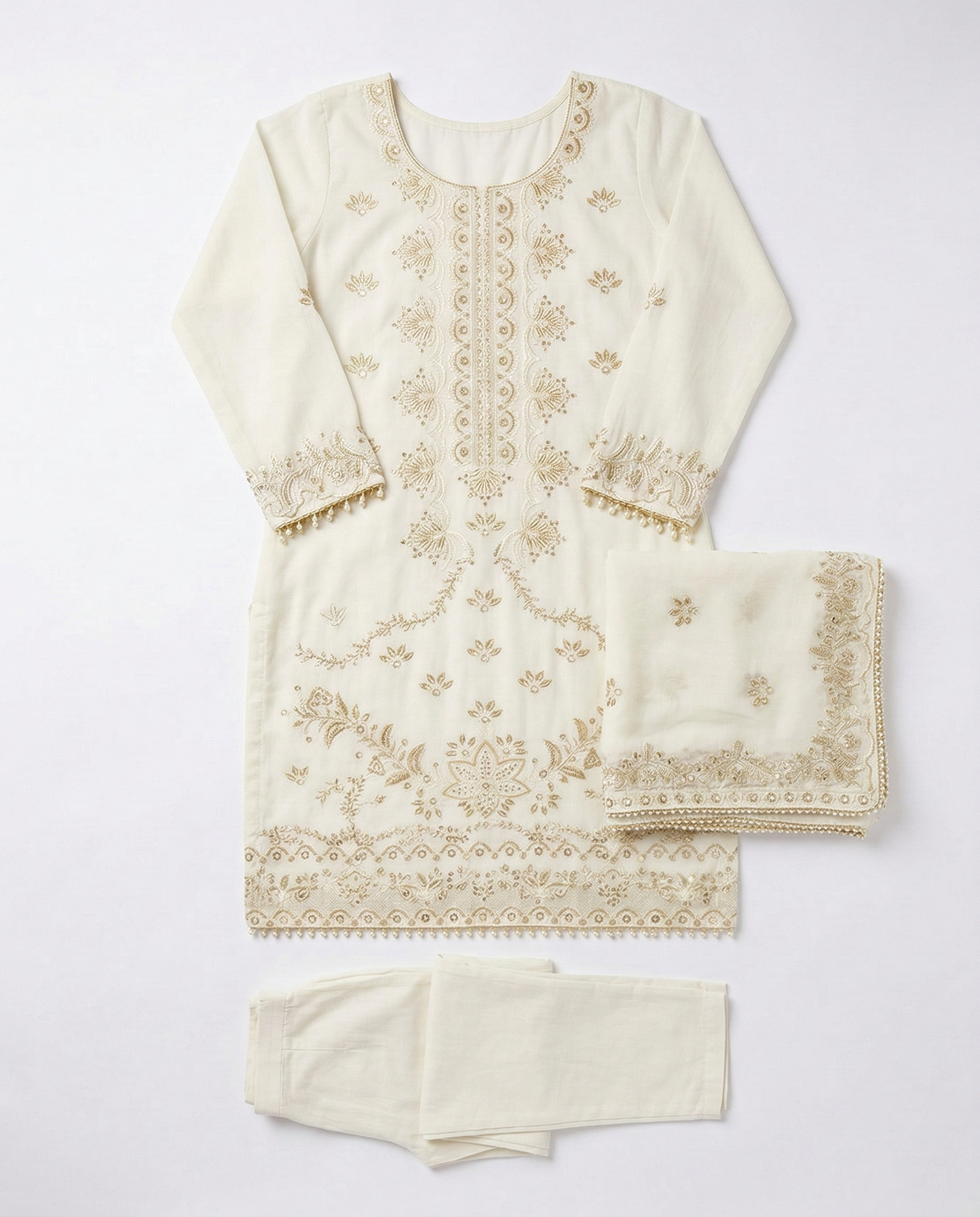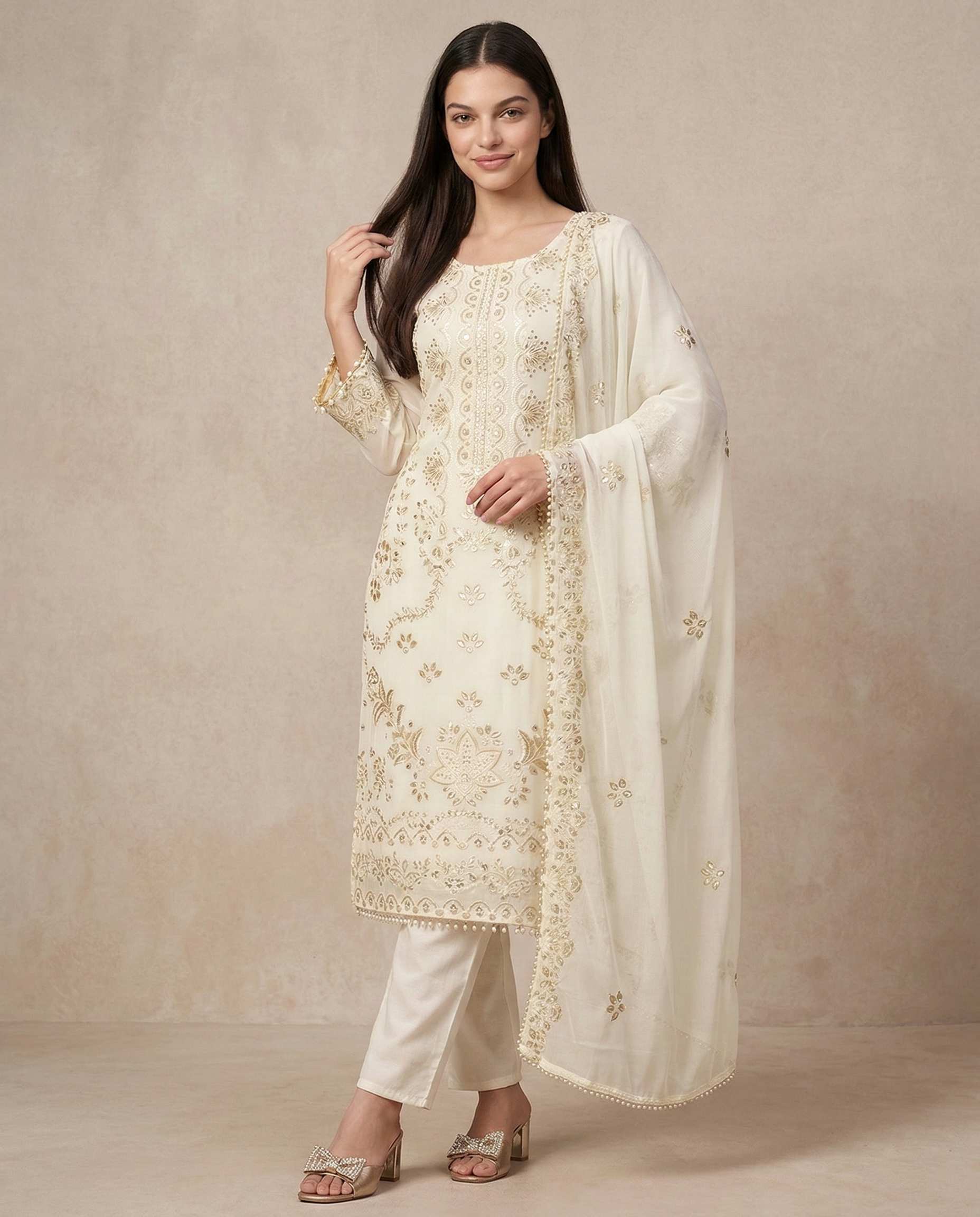 Step into timeless elegance with this beautifully crafted white embroidered kurta pant and dupatta set. Designed in premium georgette fabric, the kurta features intricate embroidery with a refined floral pattern that adds a sophisticated festive touch.